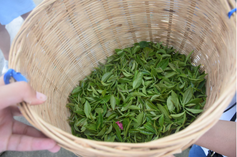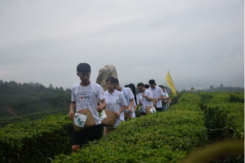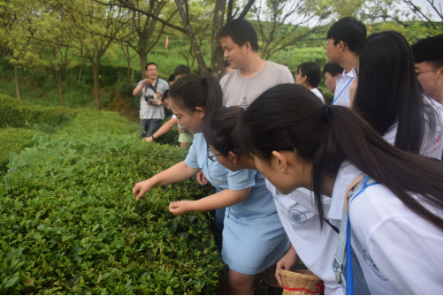 在经过工作人员简单的采茶技巧培训后,大家每人背着一个小茶叶篓有序走向了位于半山腰的茶园。雨后的茶园空气格外清新、满眼的绿色沁人心脾。俯下身子,与茶叶来个零距离接触,指尖拿捏,采下一片片新发的嫩芽。因为采茶对于茶叶的部位要求很高,或是一芽一叶、或是一芽两叶,茶的体积极小,要想采出标准化的茶叶对我们这些新手也是极有难度的。实践团采了近一个小时,集中了大家20多人的劳动成果,采出的茶才勉强铺平茶叶篓的篓底,大家也从中体味到了采茶之不易。