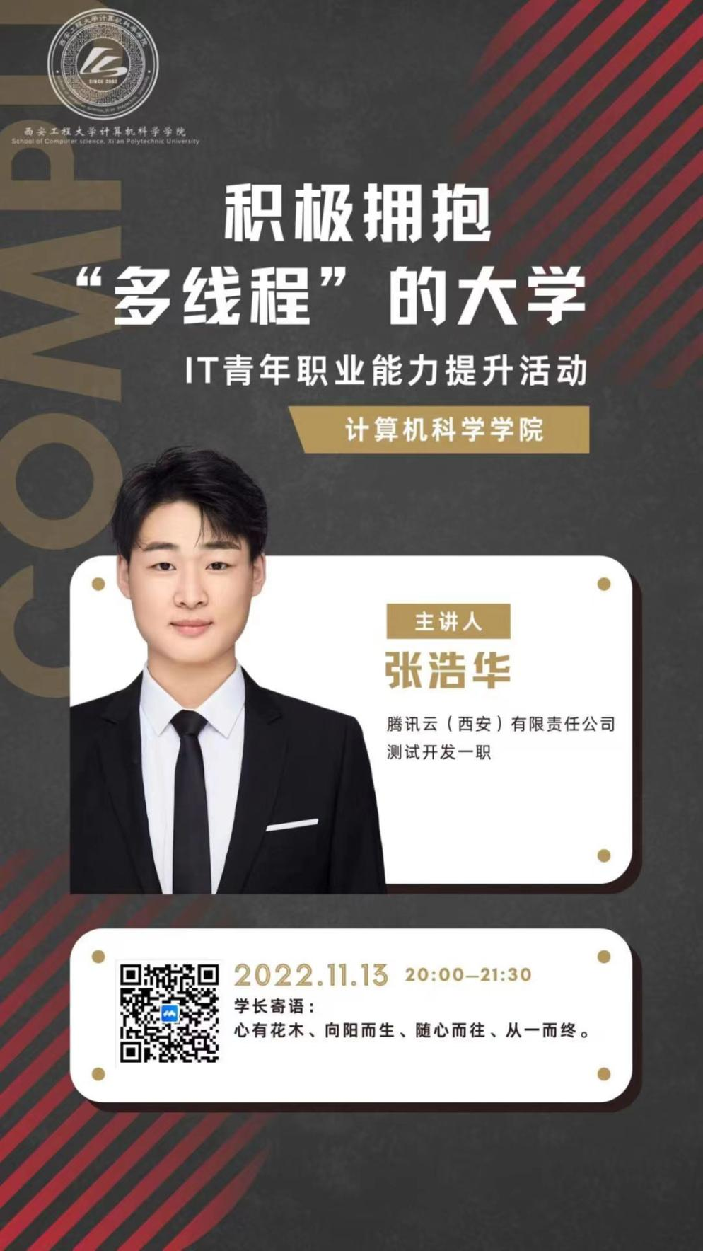 11月13日,计算机学院利用腾讯会议平台,举行IT青年职业能力大提升系列活动之积极拥抱“多线程”的大学活动,腾讯云(西安)张浩华作为本次活动的主讲人,2022级共300余名学生参加了本次线上讲座。