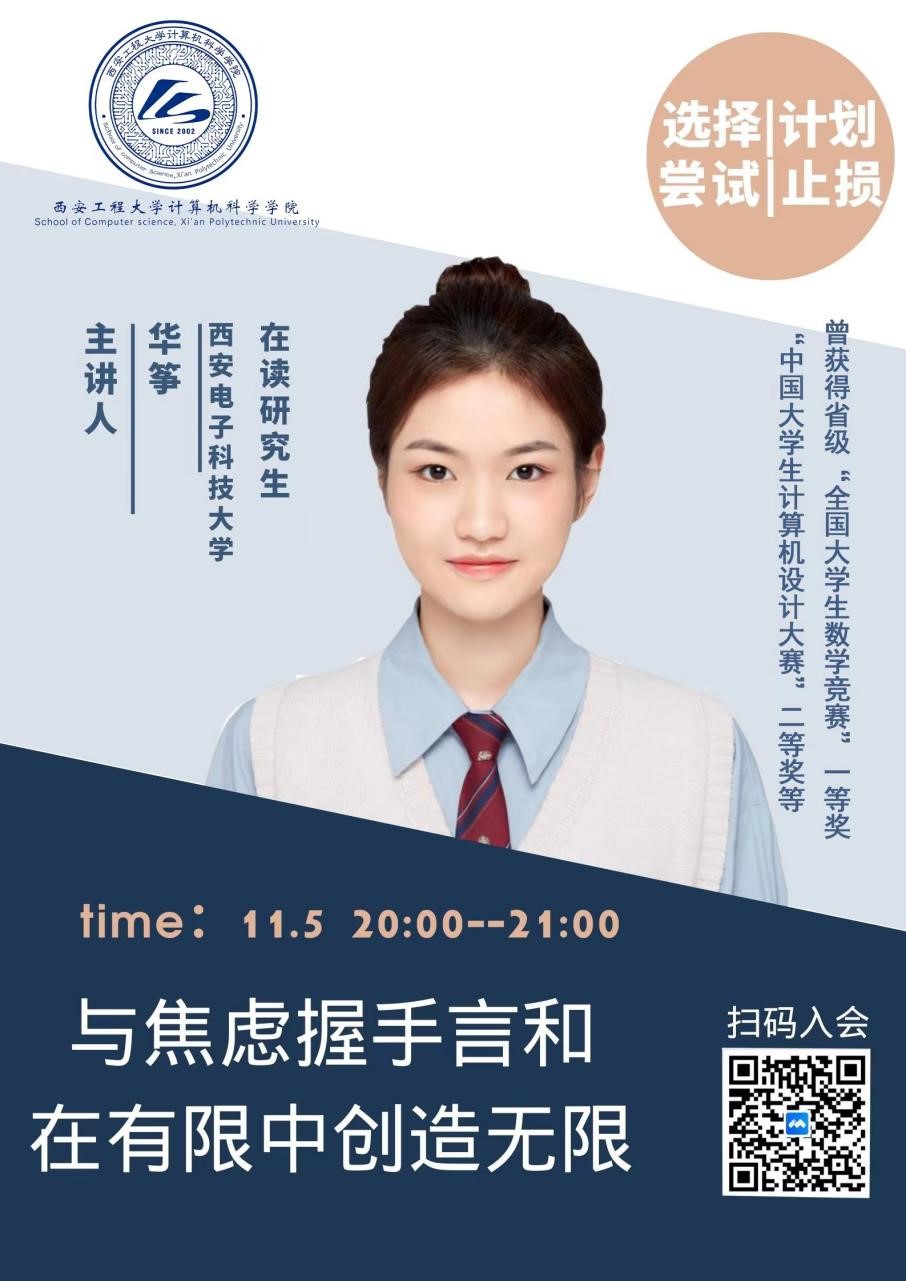 11月5日晚,beat365在线唯一官网组织召开了2022年“与焦虑握手言和,在有限中创造无限”宣讲会,旨在提倡我院学生克服焦虑。本次分享会邀请了2022届毕业生华筝分享自己的学习经验,并现场答疑解惑。全体辅导员参会,会议由朱成功主持,共有300余名学生参加。