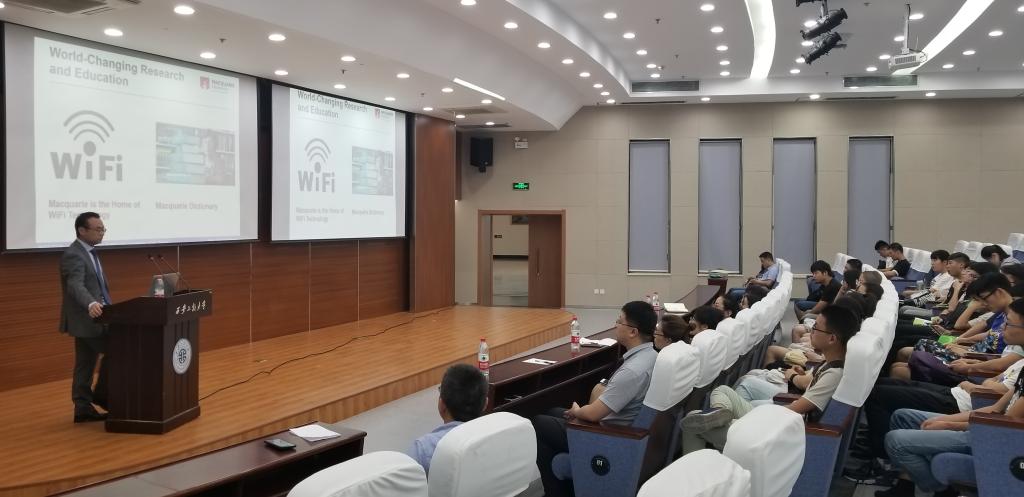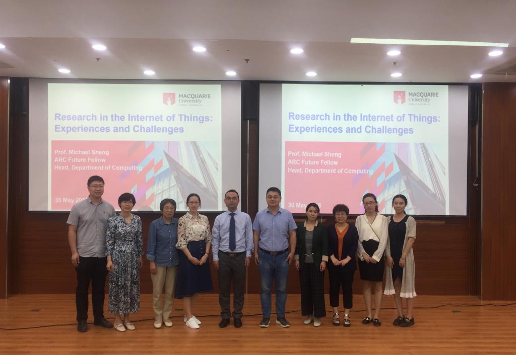 Michael Sheng教授首先简要介绍了麦考瑞大学的发展历史、计算机学院的学术研究特色、高水平研究团队及相关领域的研究成果。随后,重点对物联网十年来的发展及未来展望做了讲解,他指出,物联网作为未来十年改变世界的一项重要技术,将在提高生产力、经营效率、决策以及新的商业服务模式方面发挥关键作用。并且,他还以自身的研究经历为切入点,从国际化视角,重点剖析了物联网发展领域的关键技术和研究热点。通过此次报告会,在场师生无不受益匪浅,对物联网的发展也有了更进一步的认识。