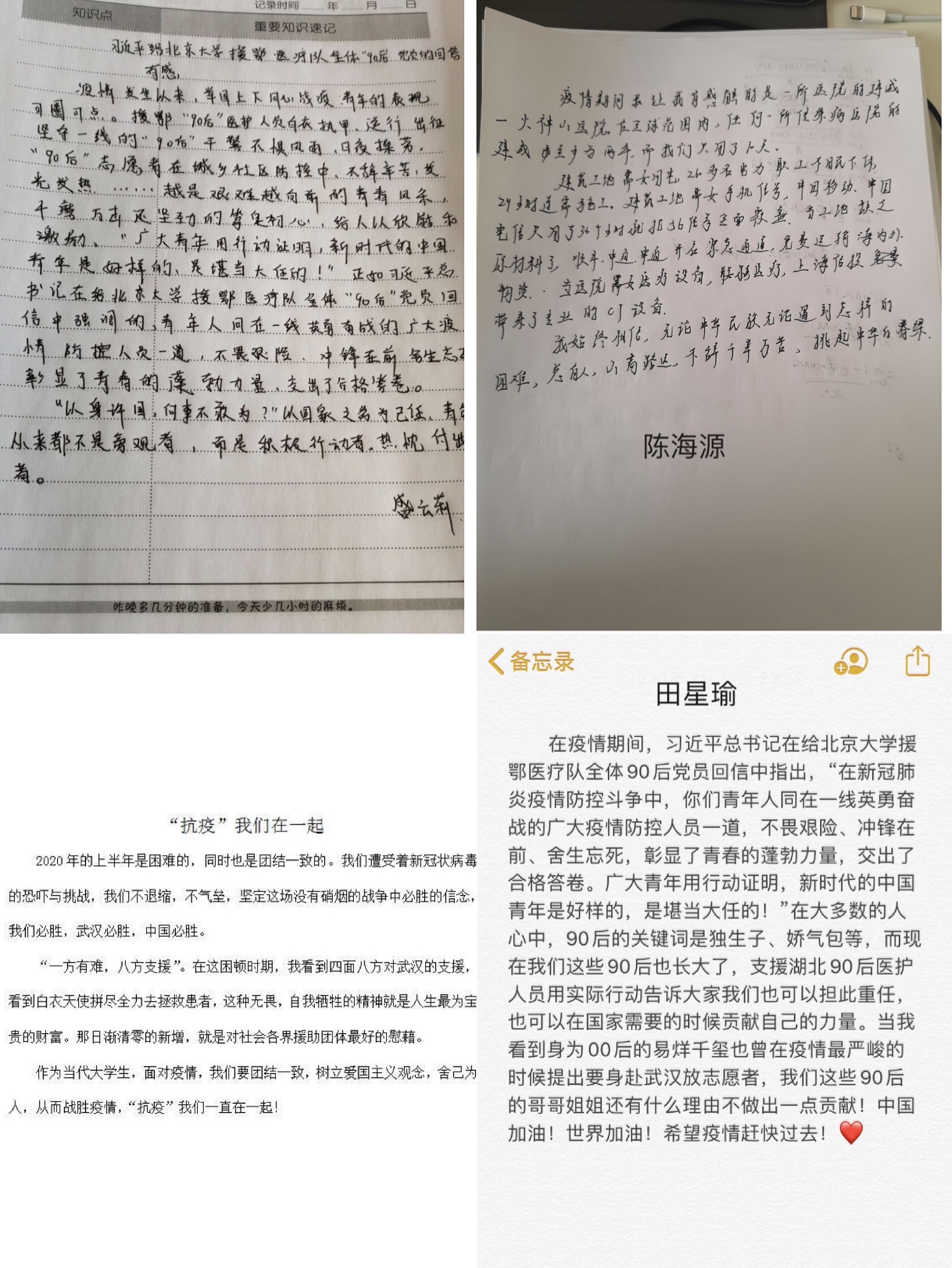 大三党员马新航表示,面对疫情,奋战前线的医护人员无惧艰险、无畏生死,留下“最美逆行者”的身影;使命担当的人民解放军义无反顾地投入与疫情防控斗争第一线,守护家园,保护人民;不辞辛苦、日夜兼程的火神山医院建设者与时间赛跑,与疫魔赛跑。我们要以习近平总书记重要讲话和重要指示批示精神为指引,坚定必胜信念和方向,凝聚起众志成城、全力以赴、共克时艰的强大力量。我们坚信,疫情终将过去,春天必会到来。