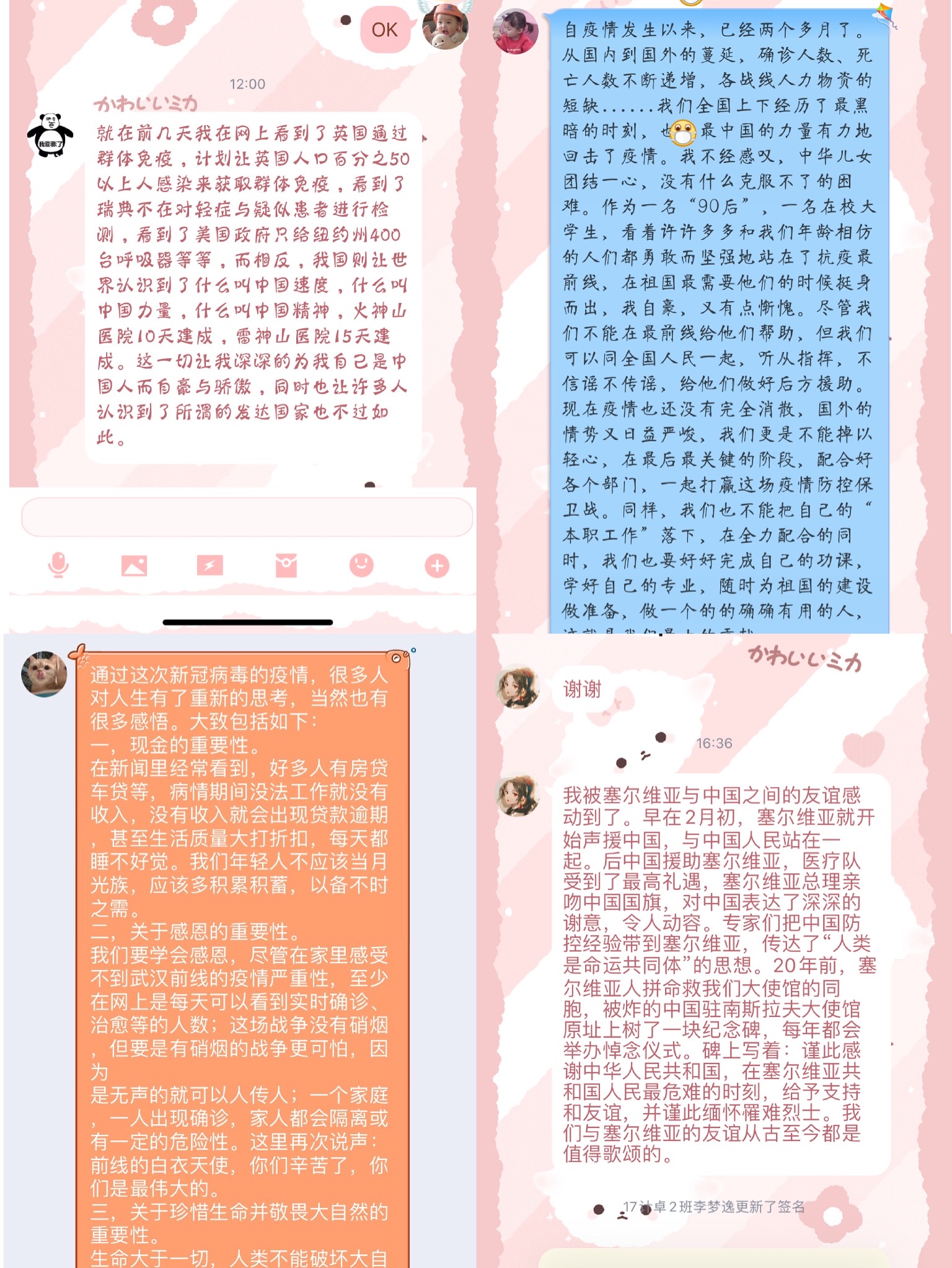 党支部组织委员牛婷婷表示,自疫情发生以来,作为一名在校大学生,尽管我们不能在最前线给他们帮助,但我们可以同全国人民一起,听从指挥,不信谣不传谣,给他们做好后方援助。同样,我们也不能把自己的“本职工作”落下,在全力配合的同时,也要好好完成自己的功课,学好自己的专业,随时为祖国的建设做准备,做一个有用的人,这就是我们最大的贡献。