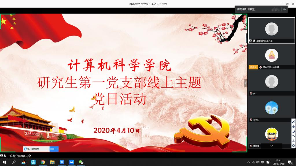 为深入学习贯彻习近平总书记关于疫情防控重要讲话、重要指示批示精神,积极响应陕西省委和校党委号召开展向“三秦楷模”等先进人物和先进集体学习的活动。4月10日下午,beat365在线唯一官网研究生第一党支部利用网络平台开展线上专题组织生活会和主题党日活动,支部全体党员参加,会议由党支部书记王雅慧主持。