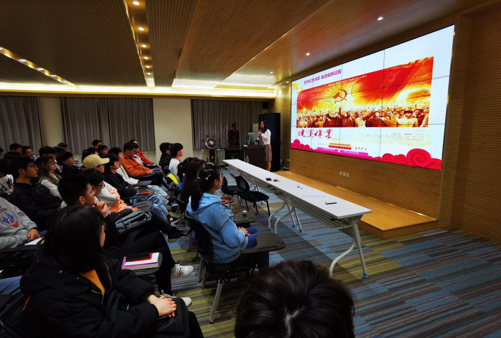 观影前,左温慧首先向大家进行微党课讲授,她介绍了我党发展历史上的三个重要阶段:新民主主义革命时期、社会主义探索时期、建设有中国特色的社会主义新时期,简要回顾了中国共产党百年奋斗的艰苦岁月和光辉历程,并强调青年学生一定要深刻了解党、充分认识党,才能永远跟党走。