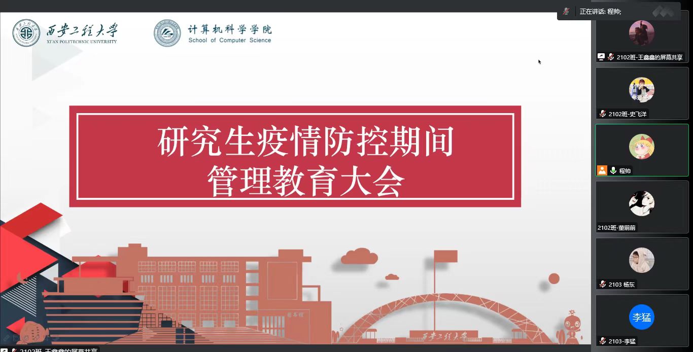 为贯彻陕西省高校疫情防控工作相关会议精神,落实学校疫情防控最新工作要求,加强我院研究生学术道德和诚信教育,11月30日下午,我院举办了线上研究生疫情防控教育管理大会暨研究生学术道德和诚信教育大会。研究生辅导员程帅和全体研究生参加了此次会议。