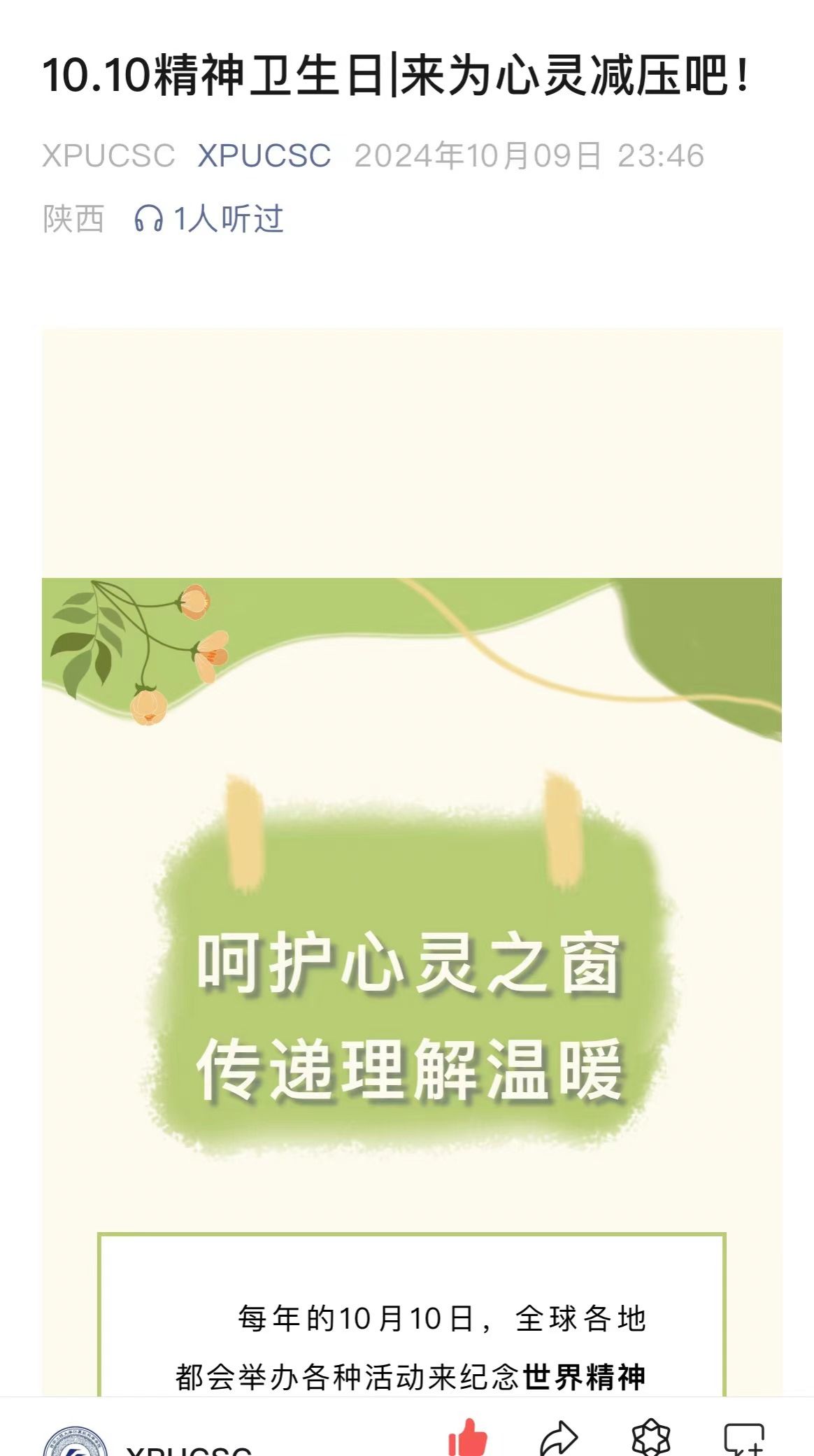 10月9日,学院通过官方微信公众号XPUCSC推送题为《10.10精神卫生日 来为心灵减压吧!》的文章,为全院师生普及世界精神卫生日的由来和意义,同时介绍了如何面对并克服大学生活中各类心理困惑的知识,进一步在学院营造了浓厚的心理健康教育氛围。