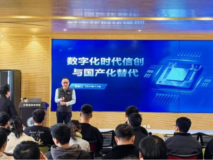 报告会开始,陈新江以汽车行业的重大变革为切入点,引出了当今世界的数字化时代与信创背景,并通过“三新一高”(新技术、新业态、新模式和高质量发展)强调高质量发展是新时代发展的必然趋势,发展新质生产力的关键在于创新。随后,陈新江介绍了我国信创与国产化替代任务所面临的机遇与挑战,指出加强核心技术研发、突破关键领域的“卡脖子”技术,是构建未来新产业体系的基础。接着,陈新江结合信息产业硬件基础设施、基础软件开发、芯片与处理器以及操作系统等国产化替代的典型案例,深入剖析了我国在人工智能、大数据、云计算等领域推动信息产业革新的信创技术。他鼓励广大研究生在数字化与智能化时代的背景下,顺应时代发展需求,将国家发展与个人成长紧密结合,培养数字化思维,提升数字化能力,把握信创时代发展带来的新机遇,为未来的科技创新和产业发展贡献力量。