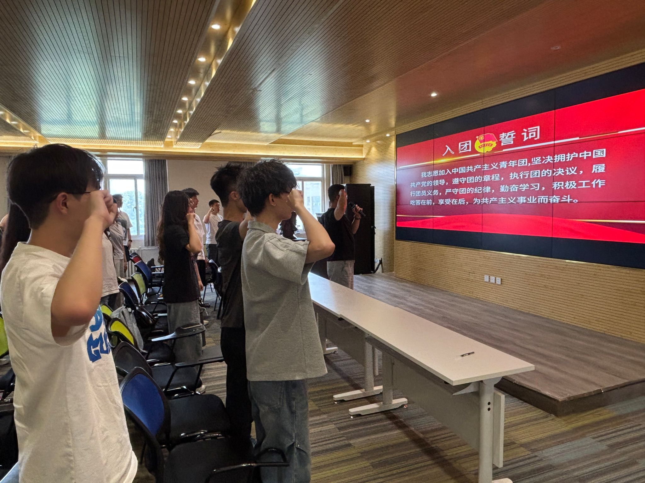 活动开始,学院团委书记薛绍凡宣读新团员名单,为新团员颁发团徽、团员证及团章。当团徽佩戴于左胸的那一刻,象征着新团员正式肩负起共青团员的使命与责任。随后,全体新团员面向团旗庄严宣誓:“我志愿加入中国共产主义青年团……为共产主义事业而奋斗!”铿锵誓言响彻会场,彰显了青年团员听党话、跟党走的坚定信念。