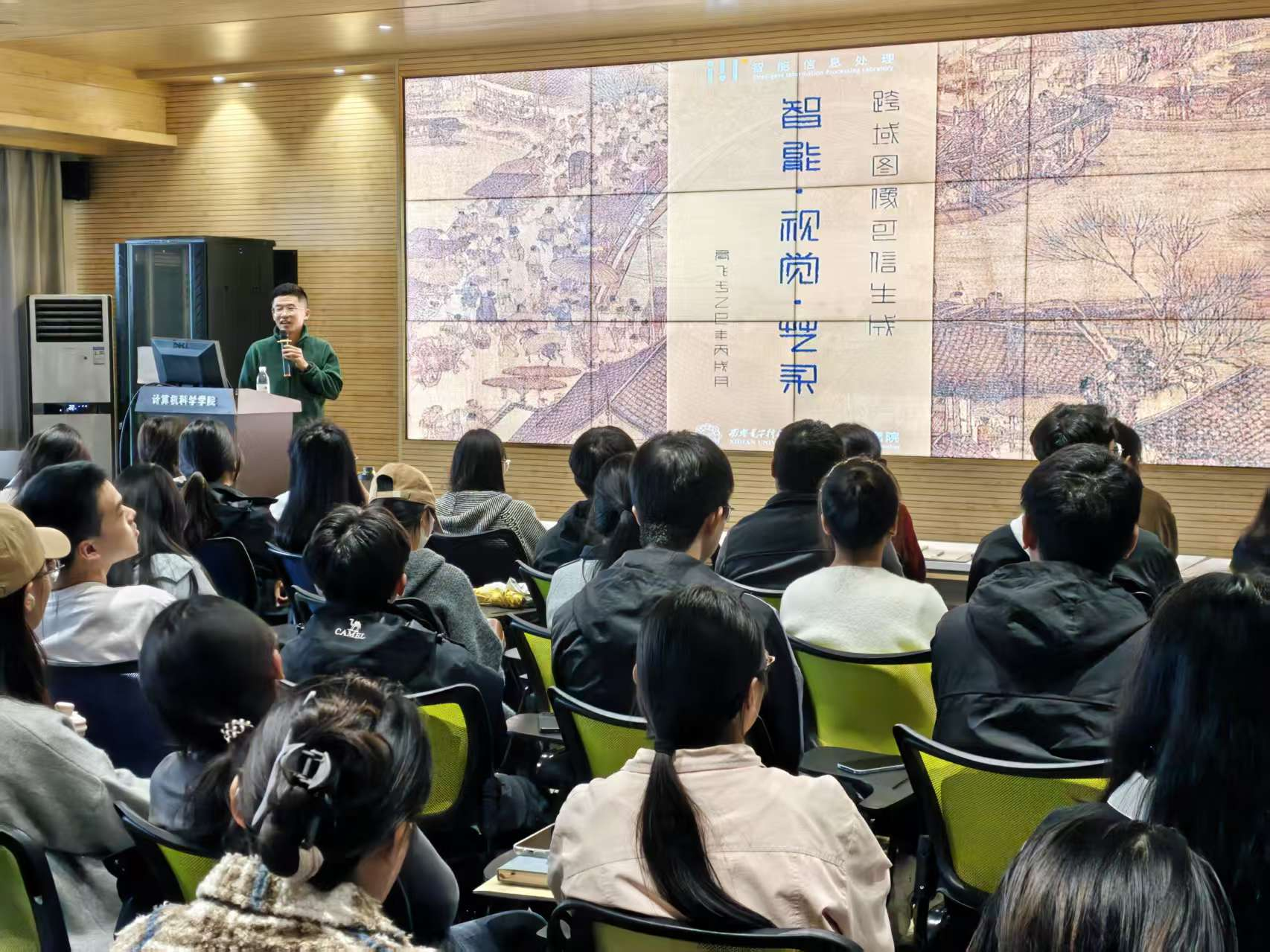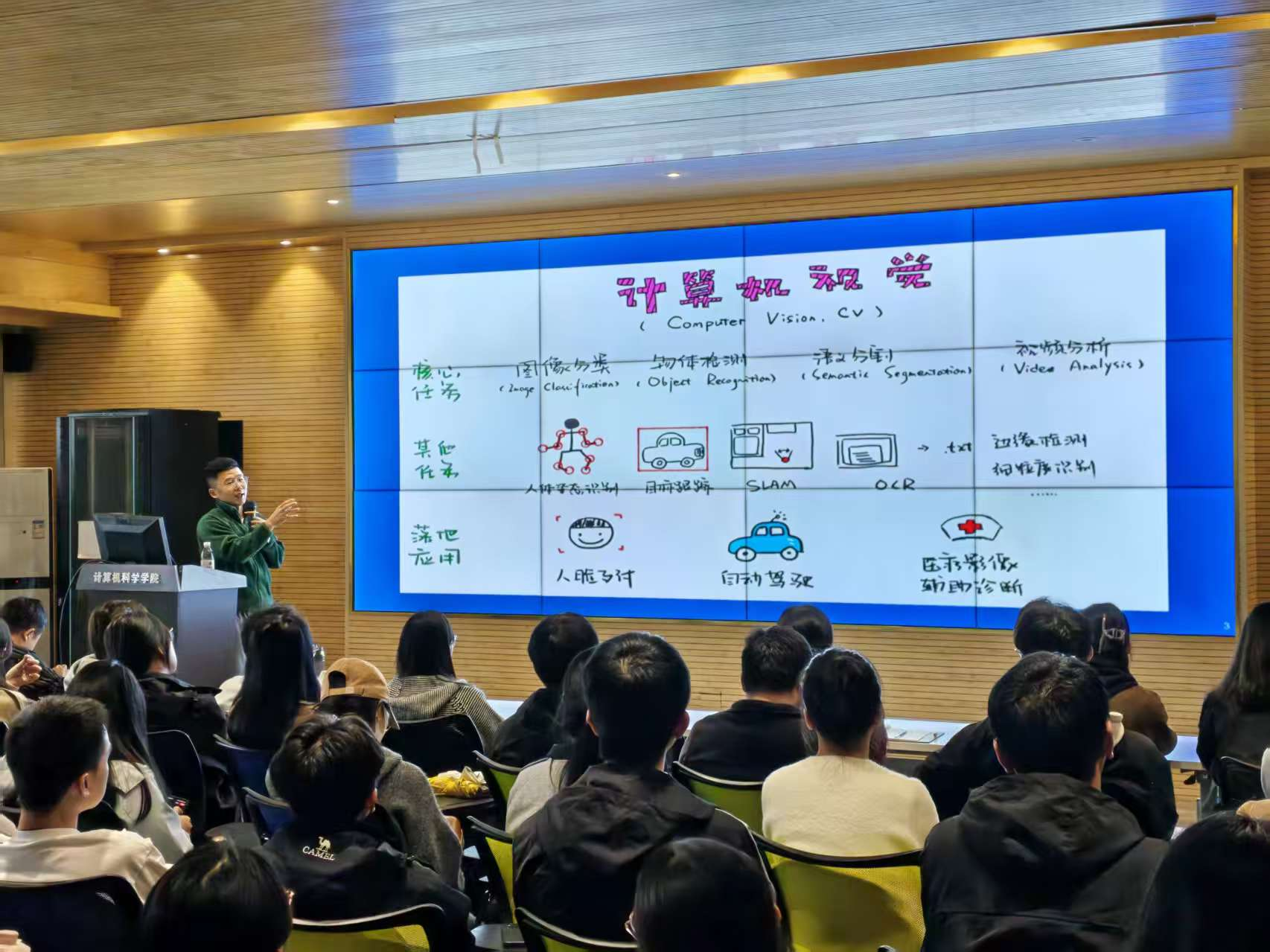 在交流环节,师生们结合自身研究与学习中的问题积极提问,讨论内容聚焦于“AIGC多模态模型的优化方向”、“跨域生成中如何保障图像可信度”和“人脸卡通化的身份信息保留技巧”等热点问题。高飞博士针对每个问题,结合行业典型案例与团队科研经验逐一解答,既指出了当前大模型在“风格一致性”和“生成稳定性”等方面的不足,也分享了科研团队在相关技术改进与落地应用中的实践经验。通过深入的互动交流,使师生们对AIGC技术发展的难点与创新路径有了更清晰的认识。