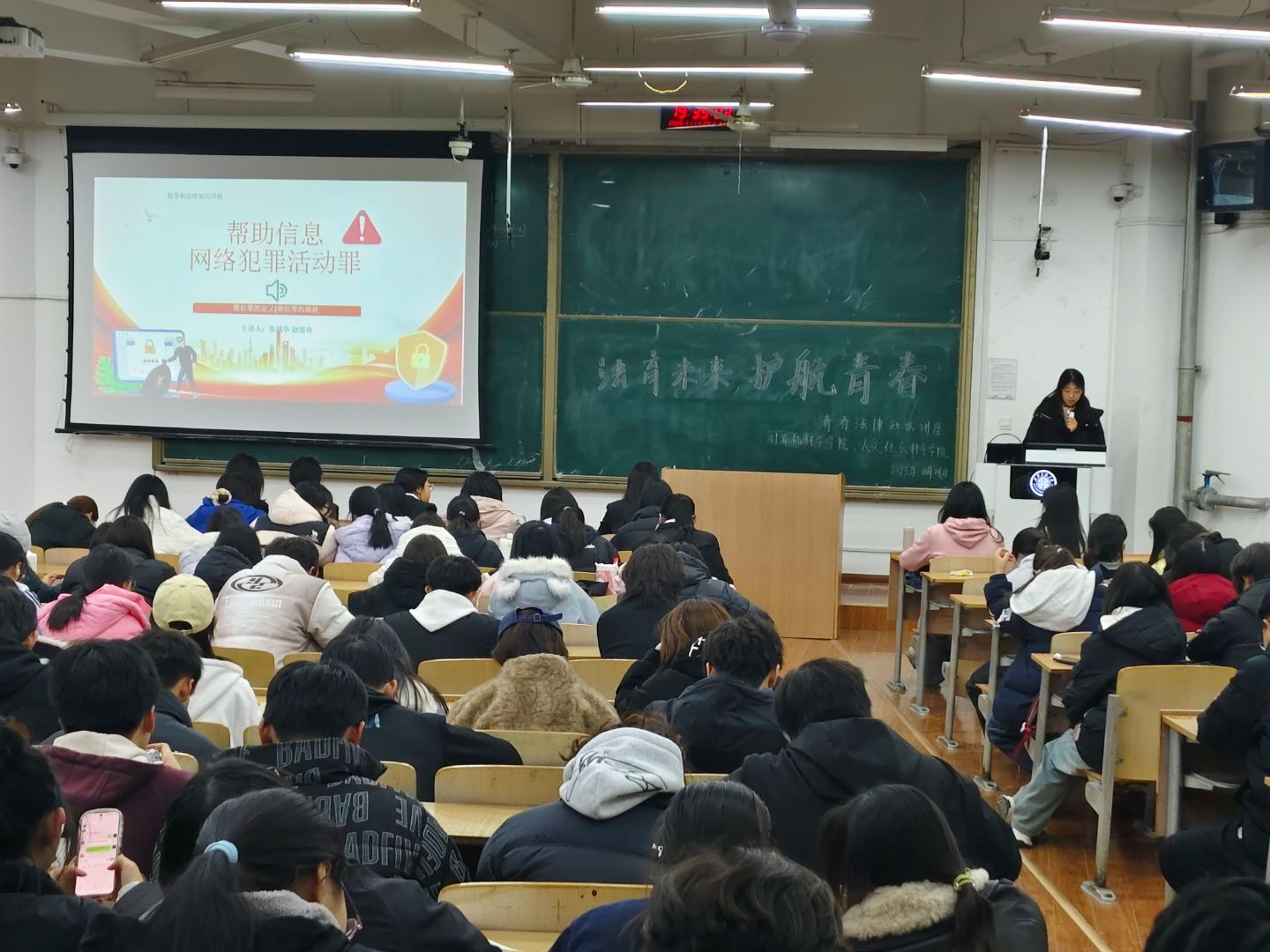 本次讲座创新采用“学生主讲、同龄人视角”模式,打破传统普法单向灌输的局限。8名法律协会的主讲学生在人文学院法学教师指导下,聚焦大学生高频法律风险场景,调研20余起高校典型案例、梳理百余篇法律法规条文,以鲜活表达和扎实储备开展宣讲。主讲学生围绕四大核心主题展开分享,精准覆盖校园法律风险点。“毒品危害与预防”板块,结合高校学子涉毒毁前程的真实案例解读《中华人民共和国禁毒法》,针对青年好奇心特点剖析危害,强化远离毒品的警示效果。“罪数形态”讲解中,融入计算机专业“代码思维”,以某高校学生出租银行卡帮诈并转走资金遭数罪并罚为例,用“代码流程图”拆解专业概念,强调“法律底线无撤销按钮”。“帮信罪防范”环节,通过大数据图谱揭示关键数据:近三年高校案件中82%涉“两卡出租”,90后占比超70%,“日结报酬”为主要诱饵。结合《中华人民共和国网络安全法》列出风险清单,演示账户自查方法并建议涉案者自首从宽。“知识产权保护”主题,以校园文创插画被商用案例解读《中华人民共和国著作权法》,提炼“固定证据——理性协商——依法投诉”维权三步法,分享成功获赔案例并建议及时进行著作权登记。