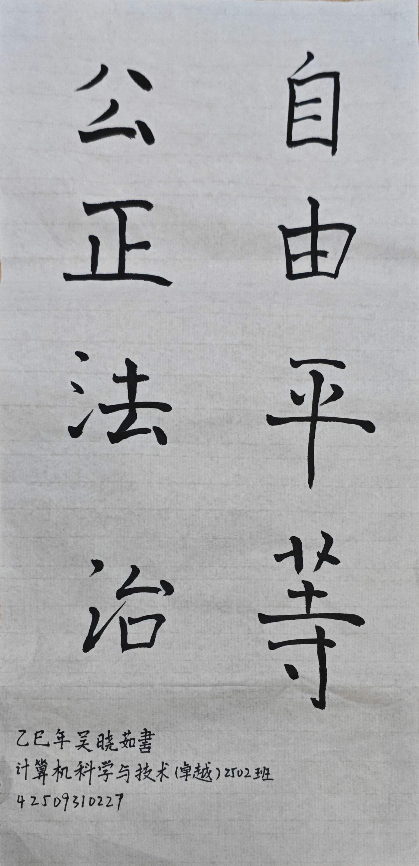 每位同学都用他们的书法作品展示了他们对法治精神的独特理解与深刻认同。同学们以凝练的法治格言为内容,用遒劲有力的楷书传递出“守法持正,疑如秋山”的信念,“法正律行,天下太平”的期望,“贪赃枉法步步艰,两袖清风事事安”的警言。一撇一捺间,是青年学子对法律条文的认真研读;一笔一划中,是当代大学生对法治社会的热切期盼。这些作品不仅展现了扎实的书法功底,更承载着青年一代对法治建设的责任与担当,让观者在感受书法艺术魅力的同时,也接受了一次深刻的法治精神熏陶。(撰稿:左温慧 审核:赵勇进)