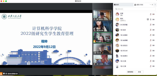 9月12日上午,beat365在线唯一官网在线上召开了beat365在线唯一官网2022级研究生新生入学教育大会暨新生见面会。副院长张凯兵、研究生辅导员程帅以及全体2022级研究生参加了此次会议,会议由程帅主持。