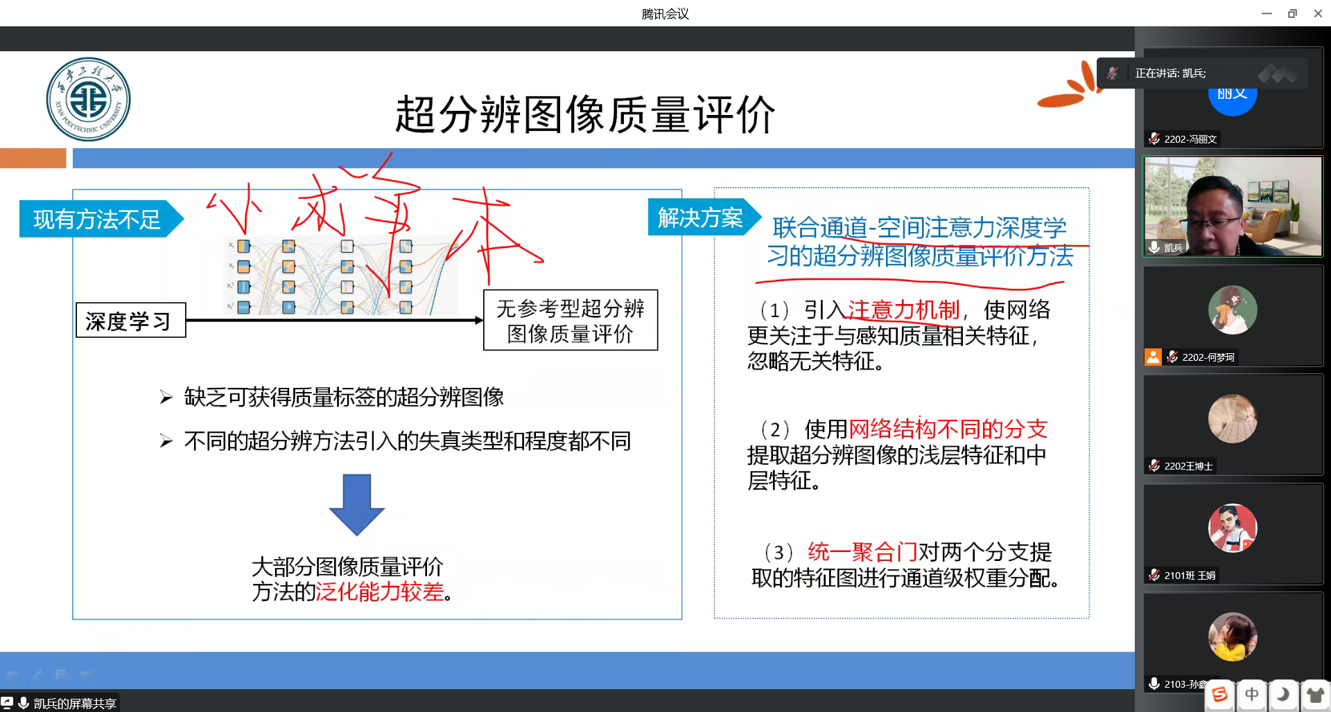 最后,张凯兵解答了同学们在科研上遇到的问题,建议研究生从阅读综述文献开始,瞄准顶刊顶会,立足学术前沿,由面到点,善于归纳总结,围绕要解决的科学问题和实际工程问题制定研究计划,循序渐进地开展科学研究。