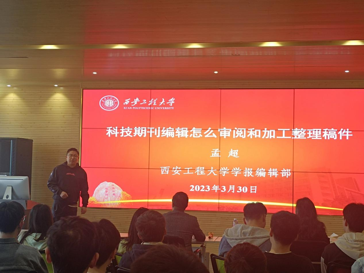 报告会上,孟超老师首先介绍了《西安工程大学学报》和《纺织高校基础科学学报》两个期刊的基本情况。然后,他从期刊编辑的角度出发,主要围绕编辑审稿的心态、稿件形式质量的评价、稿件内容质量的评价、稿件质量指标等方面详细讲解了作者在投稿过程中需要注意的问题;最后,孟老师重点围绕科技论文题目提炼、中英文摘要撰写、表格和插图的编排要求,以及参考文献的选取和编排规范等重要要素结合具体实例展开了介绍。