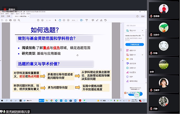 评审会开始前,薛涛院长对两位专家进行线上评审表示热烈欢迎;首先,雷秀娟教授和王晗丁教授分别结合以往科研工作经历以及在基金申请过程中的心得体会,细致入微、重点突出地讲述了撰写申请书时应重点关注的细节问题,分别就项目选题、摘要、人员组成、研究内容、项目特色及申报书撰写等方面进行了详细的指导,并解析了项目申请成功的关键因素和诸多技巧,为参会教师尤其是广大青年教师申请基金项目提供了有力的参考。然后,两位专家分别针对我院教师提交的项目申报书进行了详细点评,并给出了相应的修改建议。最后,与会教师和专家们围绕基金申请和项目评审中的问题进行了自由交流,专家就与会人员提出的问题进行了详细解答,鼓励教师们积极参与基金申报。