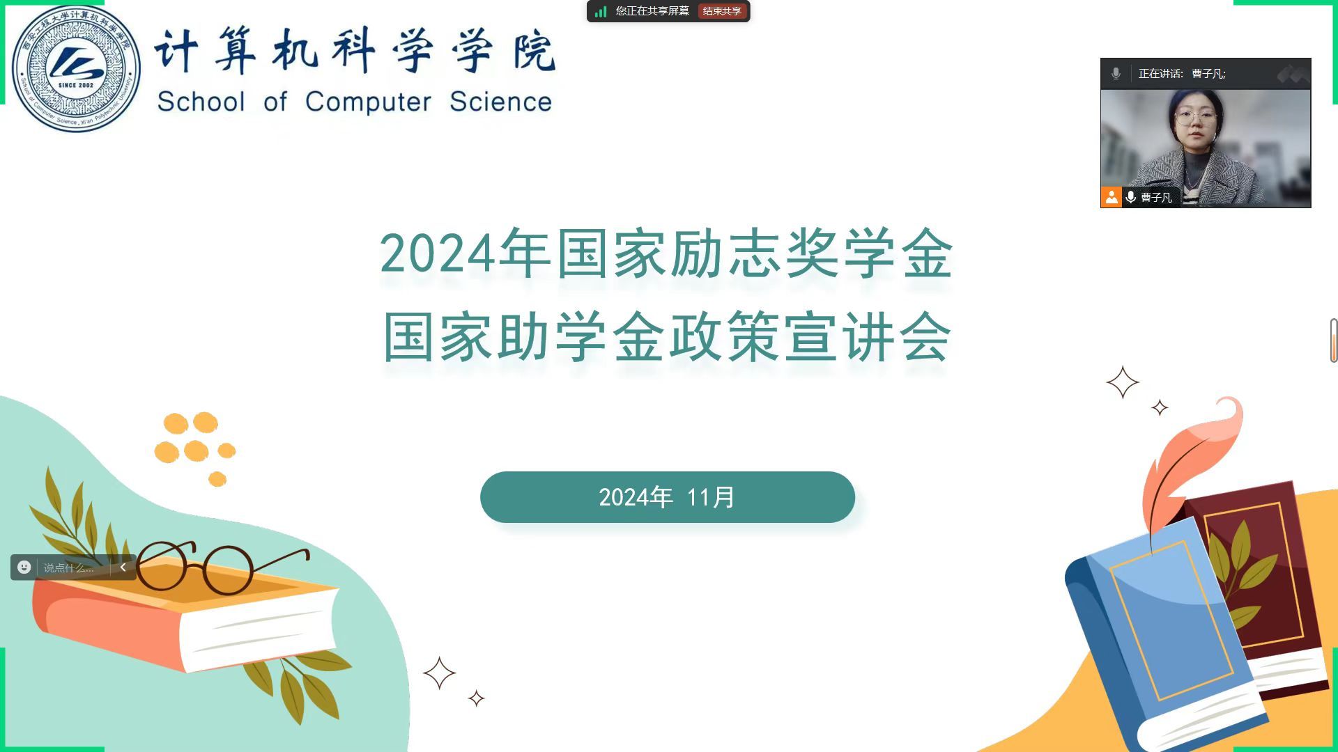 为确保国家资助政策的精准实施,激励家庭经济困难学生勤奋学习、努力进取,beat365在线唯一官网于2024年11月6日举办了2024年国家励志奖学金及国家助学金政策宣讲会。本次大会在腾讯会议上举行,由学院2023级兼资助辅导员曹子凡主讲,2023级、2022级和2021级班干部和宿舍长参与。她全面解读了国家励志奖学金及国家助学金的申请条件、资助标准及评审流程,确保学生对政策有深入的理解和正确的认识。