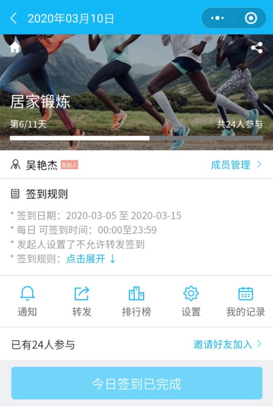 我校目前已经线上开学二周了,许多教师、行政人员每天居家办公、准备网课、在线教学、信息统计等等,花费大量时间面对电脑屏幕、手机,大多足不出户,锻炼身体就显得尤为重要了。在三八妇女节这个属于女同胞的节日里,学院女教职工们积极参加了居家锻炼活动打卡,相互鼓励,坚持锻炼。此次锻炼活动将持续一周,相信会有越来越多的老师加入健身的行列,让我们用积极的心态抗击疫情,用更加充沛的精力投入线上教学工作中,期待在不久的将来,在满园春色的校园里相聚!(撰稿:吴艳杰 审稿:王雅慧)